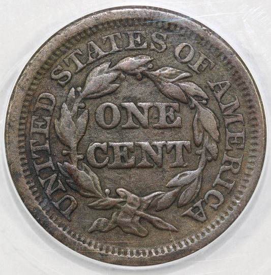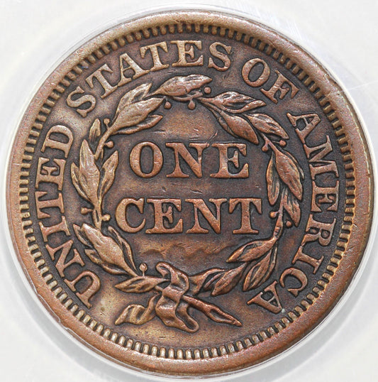 1855 1c N-10 Slanting 5's Braided Hair Large Cent ANACS EF 45 Details