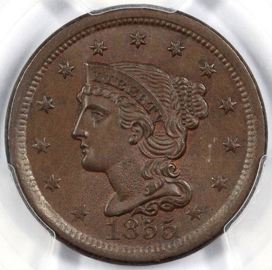 1855 1c N-1 Upright 55 Braided Hair Large Cent PCGS and CAC MS 65+