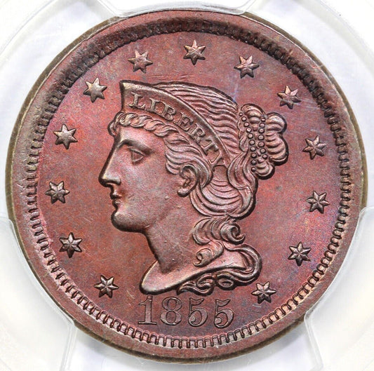 1855 1c Upright 55 N-4 Braided Hair Large Cent PCGS and CAC MS 65 BN