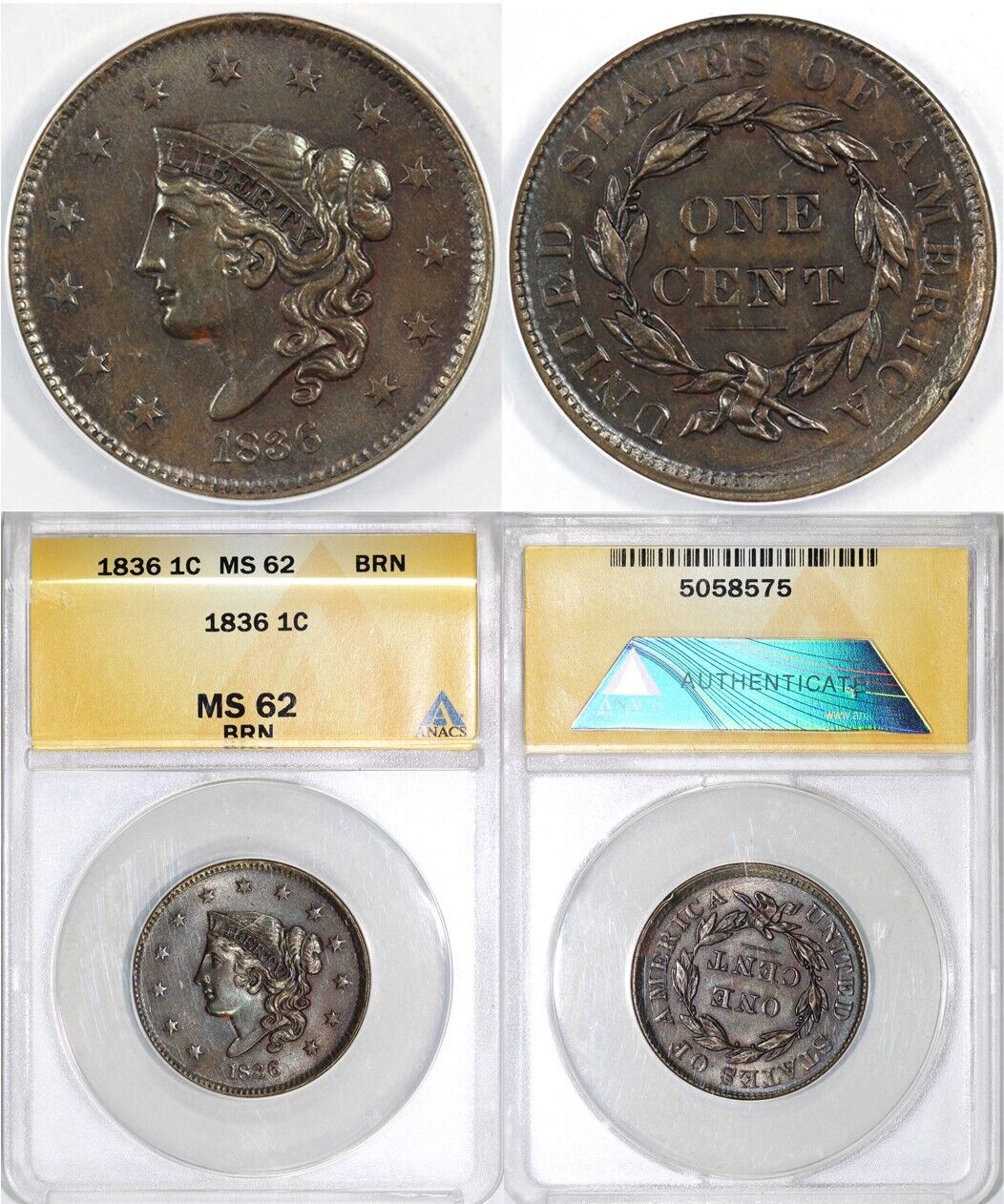 1836 1c Matron Head Large Cent ANACS MS 62 BN