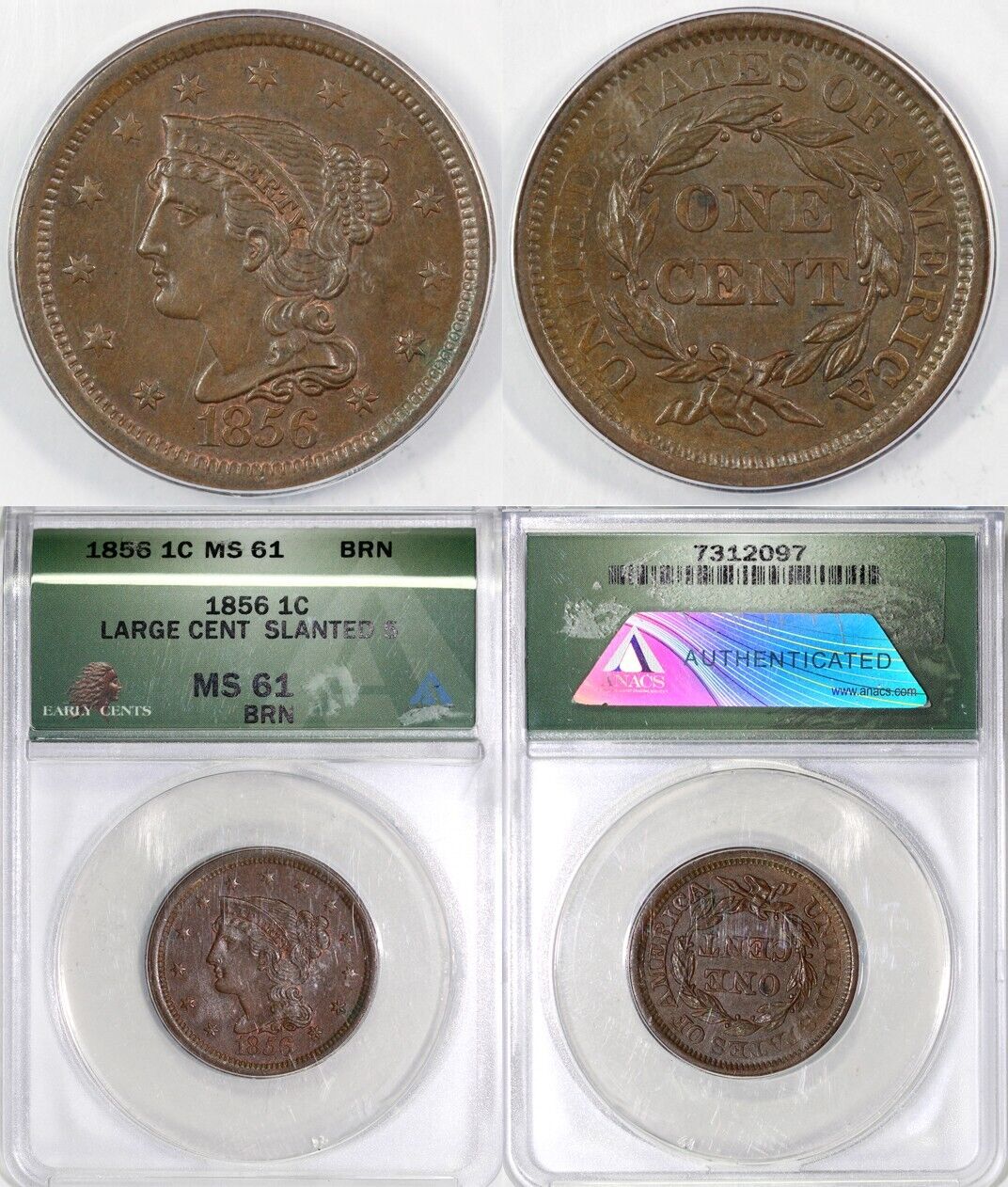 1856 1c Slanted 5 Braided Hair Large Cent ANACS MS 61 BN